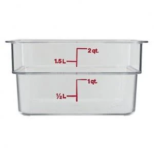 Revolutionise your kitchen with durable CamSquare Food Storage, ensuring extra freshness and savings from your ingredients! This crystal-clear design is virtually unbreakable, outstanding for fast paced kitchens. Withstands temperatures -40 degrees C to 99 degrees C., acids, stains, and odours for a long-lasting improvement on your storage system. Moulded in handles on larger sizes allow both safe carrying and quick drying, while easy-to-read graduations on all options offer at-a-glance inventory. Cambro’s snap-on covers fit tightly and protect contents from cross contamination.