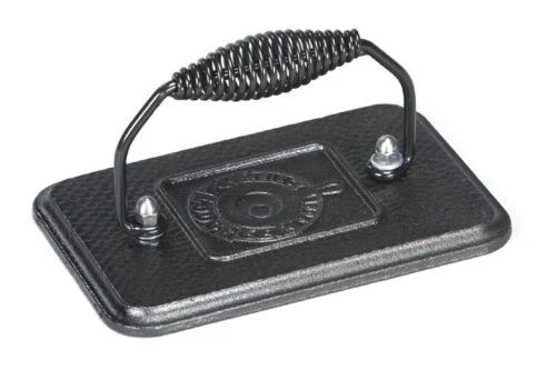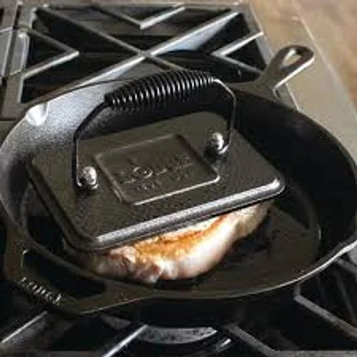 On the stove top or grill, the Lodge rectangular grill press is perfect for eliminating curl from bacon or ham, pressing unwanted fats from your burgers or sausages, and holding heat in your grilled sandwiches. The heavy-duty cast iron base has a unique hammered finish and features a safe cool-grip spiral handle.