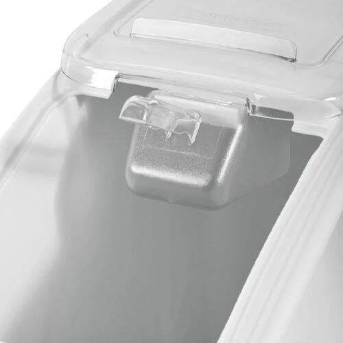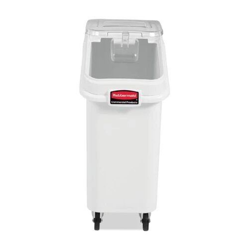 The Rubbermaid Commercial ProSave® Ingredient and Food Storage Mobile Bin is a bulk food storage container on wheels. With a slanted front, sliding opening, and scoop, these food storage containers make it easy to transport ingredients.