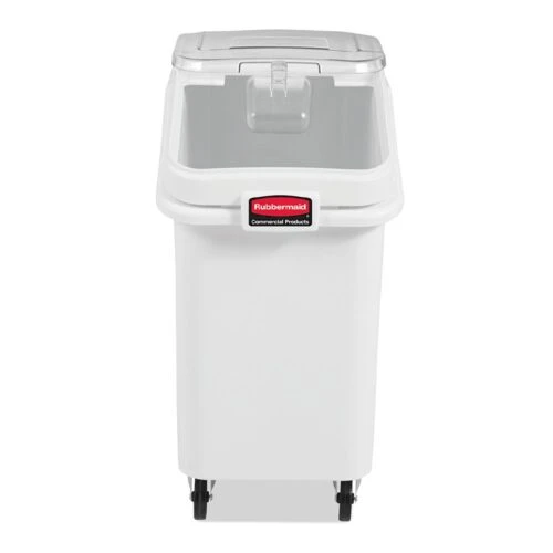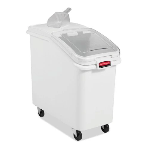 The Rubbermaid Commercial ProSave® Ingredient and Food Storage Mobile Bin is a bulk food storage container on wheels. With a slanted front, sliding opening, and 0.94L scoop, these food storage containers make it easy to transport ingredients.